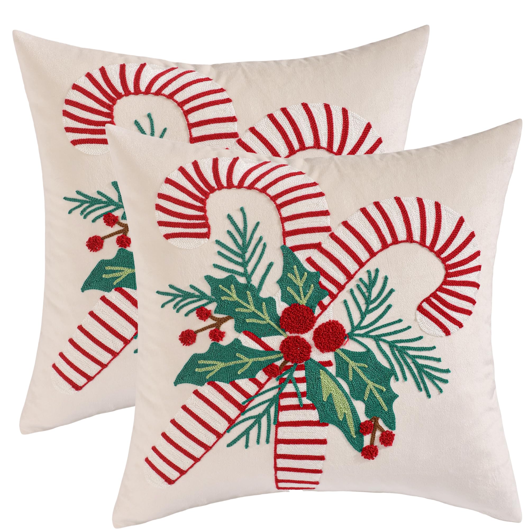 Dimensional embroidery: Crisp red-and-white canes with green foliage; berries rendered in raised tuft/loop stitches for a tactile pop