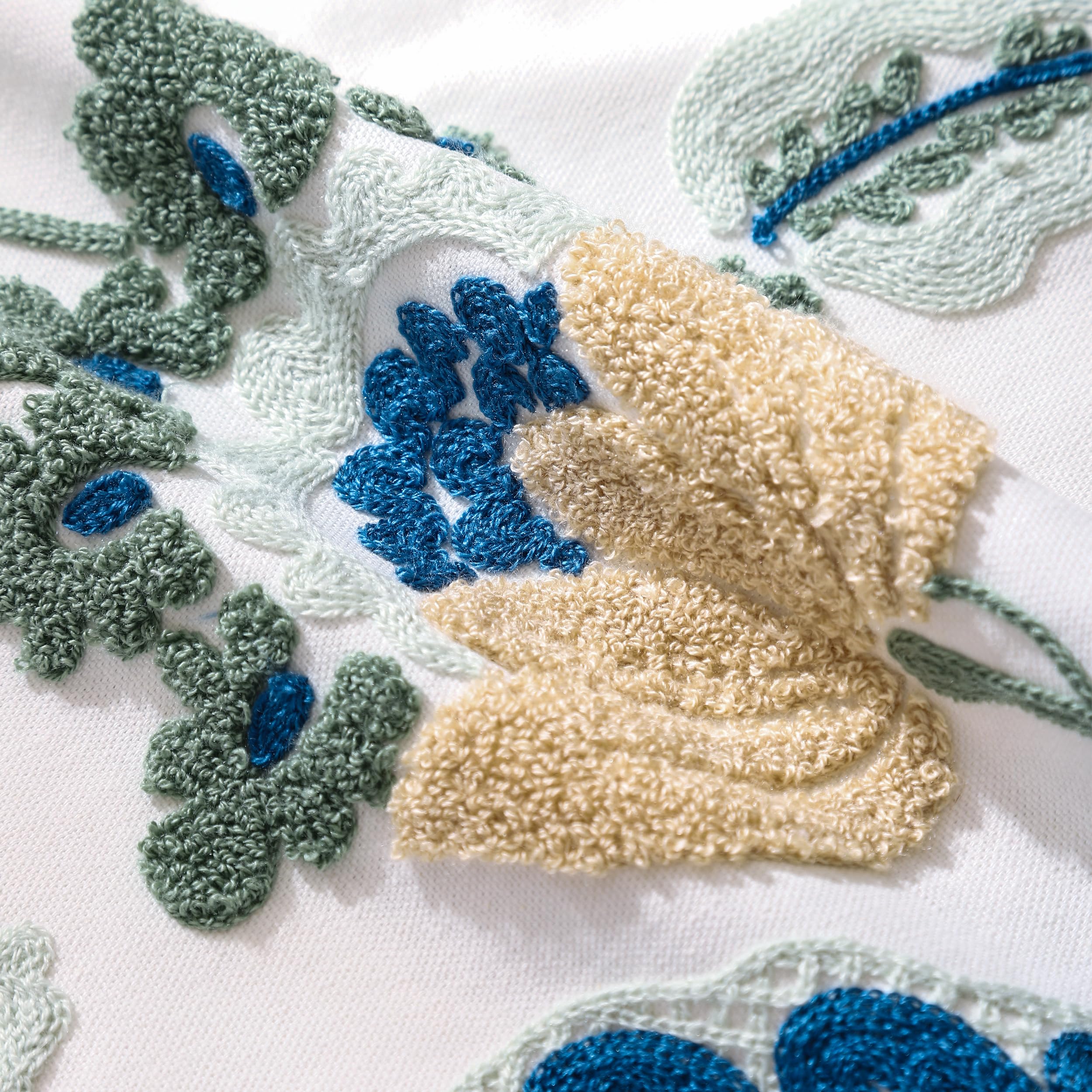 Shell: High-density cotton-feel fabric with multi-technique embroidery in blue, green, and gold