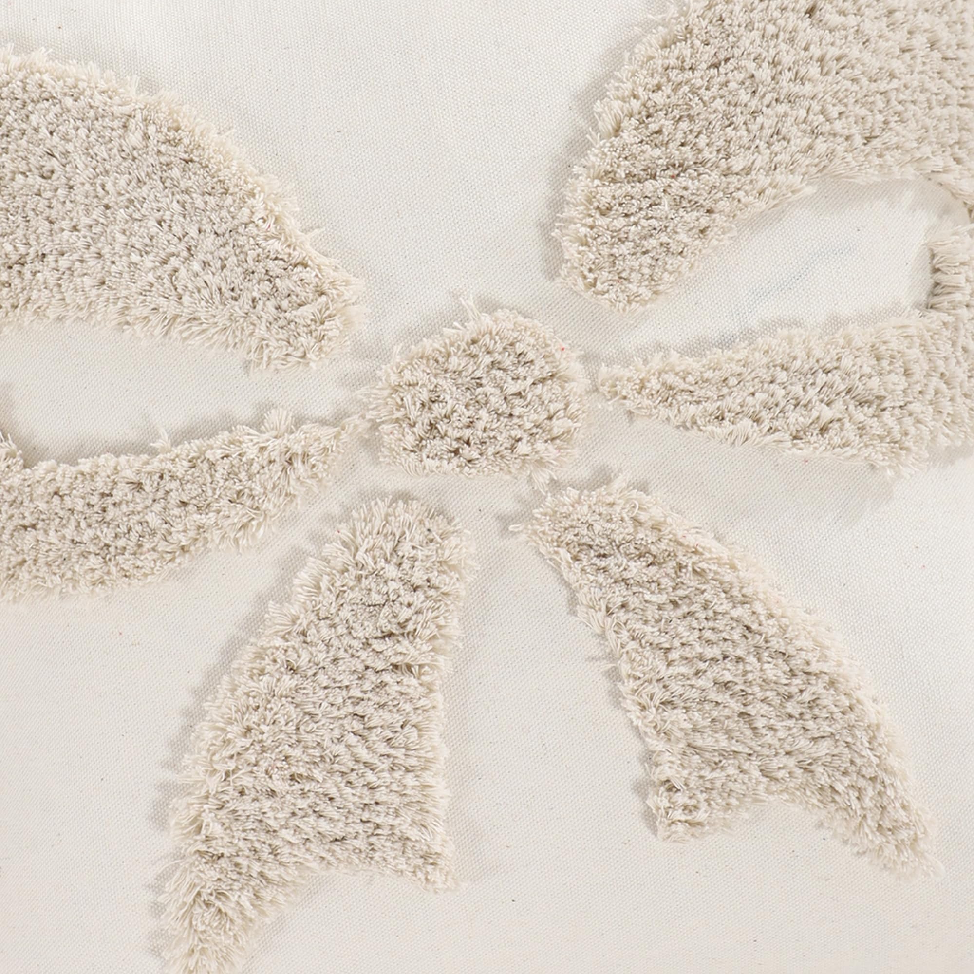 Shell: Cotton-feel canvas with dense loop-tufted bow motif in warm beige